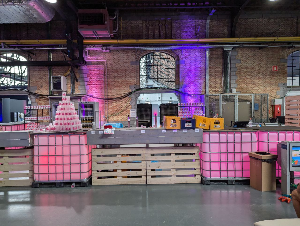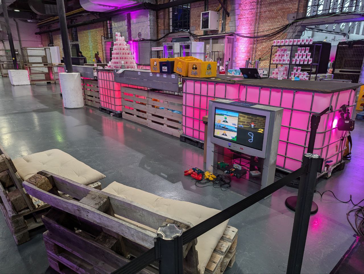 The main counter where beer was handed out. Behind the counter, there was a tap and 2 refrigerators with drinks. There were also small couches and a PlayStation 1 with racing games on the right.
