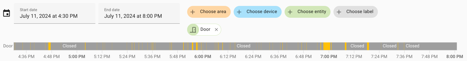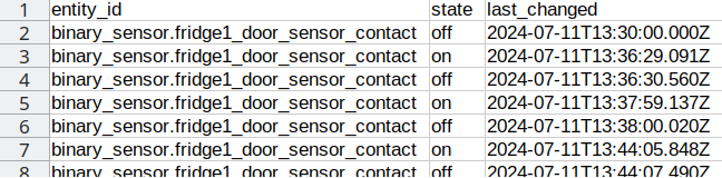 Of course, you could count the number of yellow stripes on this graph, which are the moments when the door was opened. But you can export this to a csv file and get the following: