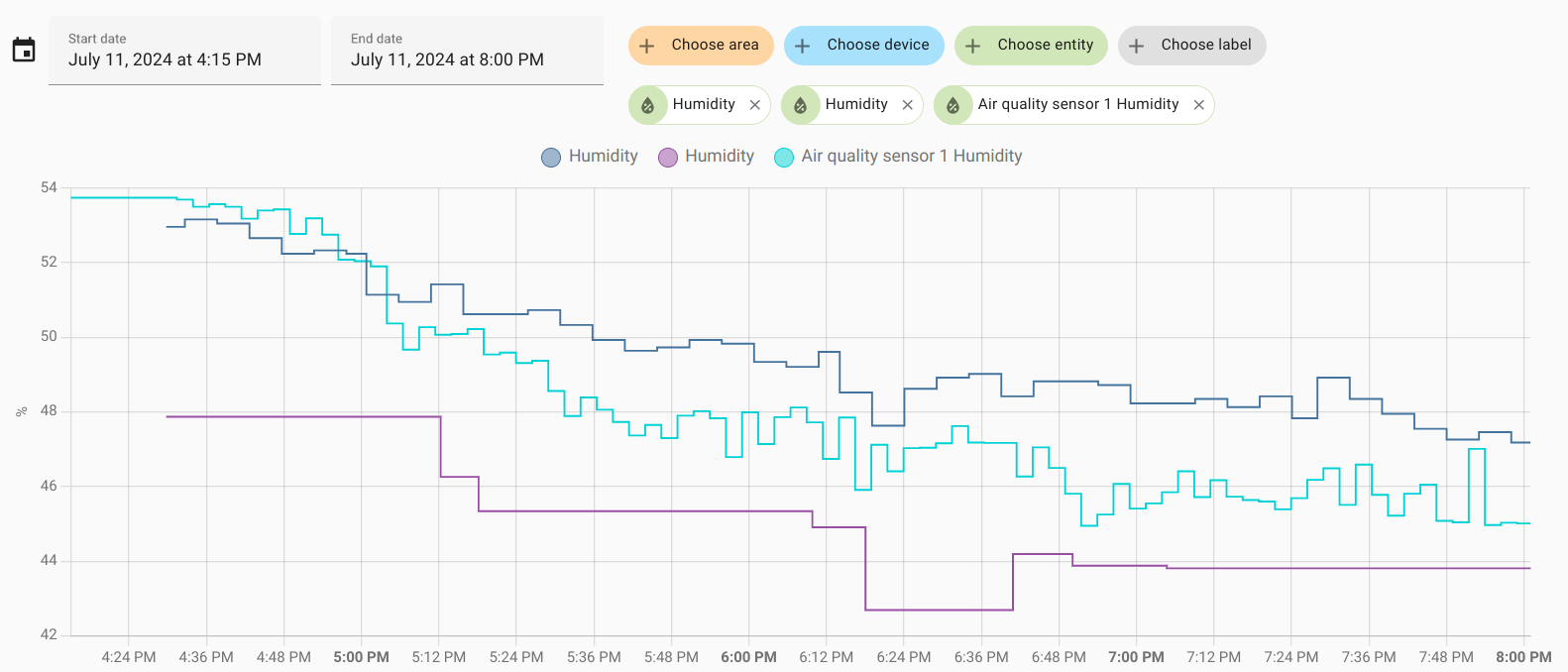The temperature drop is related to the rain on the second day, which is clearly visible on the humidity graphs. Humidity increased by 10-15%. First day: