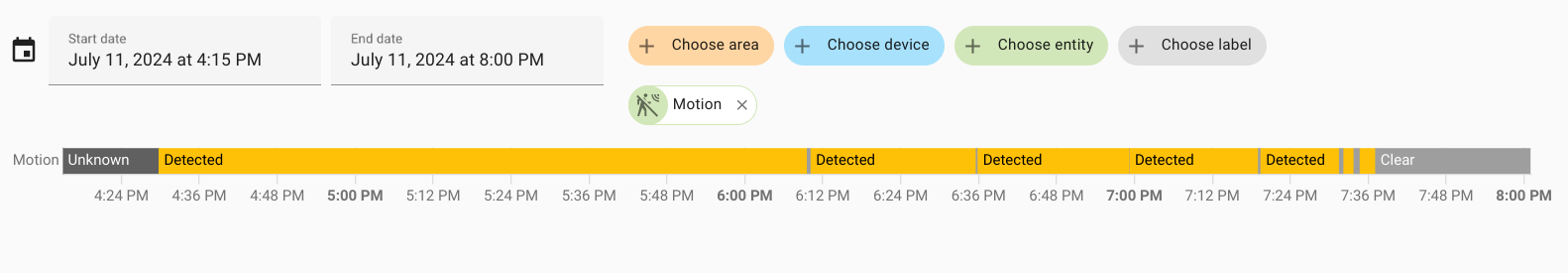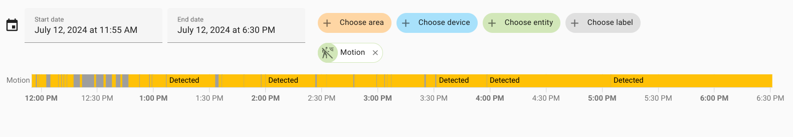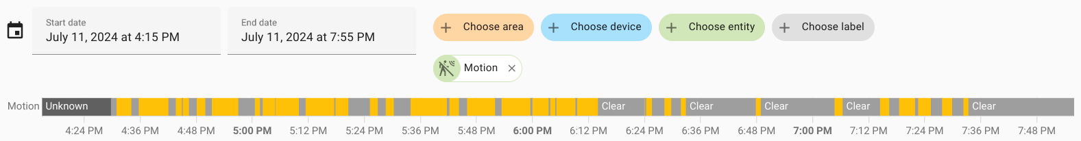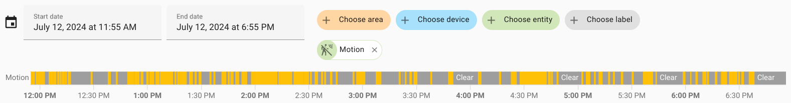 Yellow indicates the time when someone was near the bar, gray - when there were no people. Motion sensor at the bar - first day: