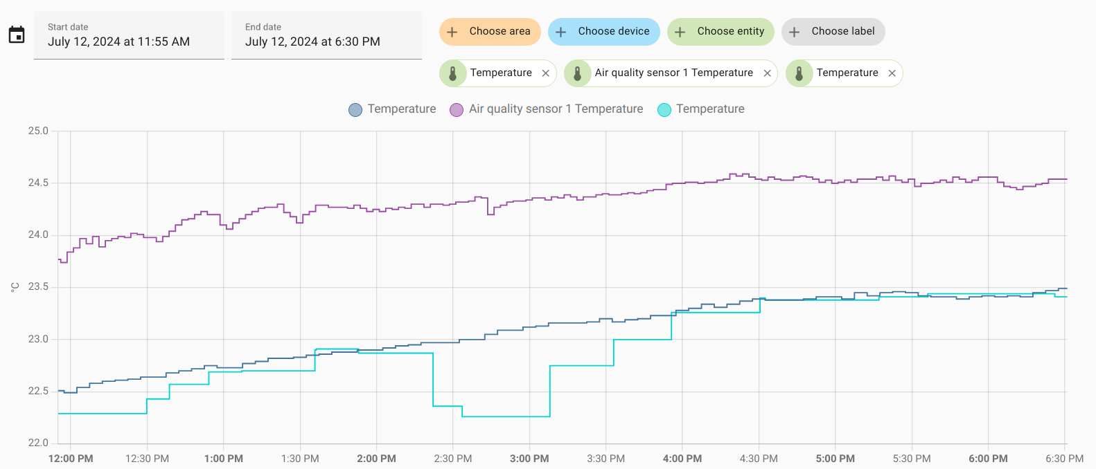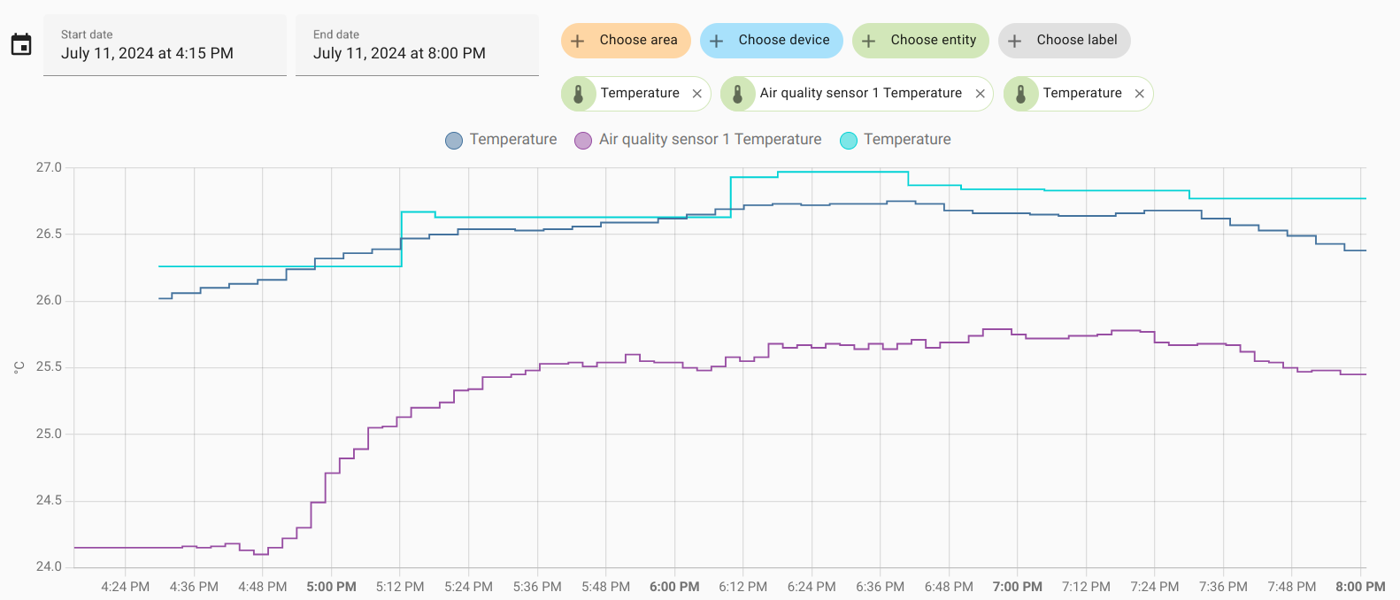 First day (July 11) - as can be seen from the graphs, a comfortable temperature of 25-27 degrees was maintained indoors.
