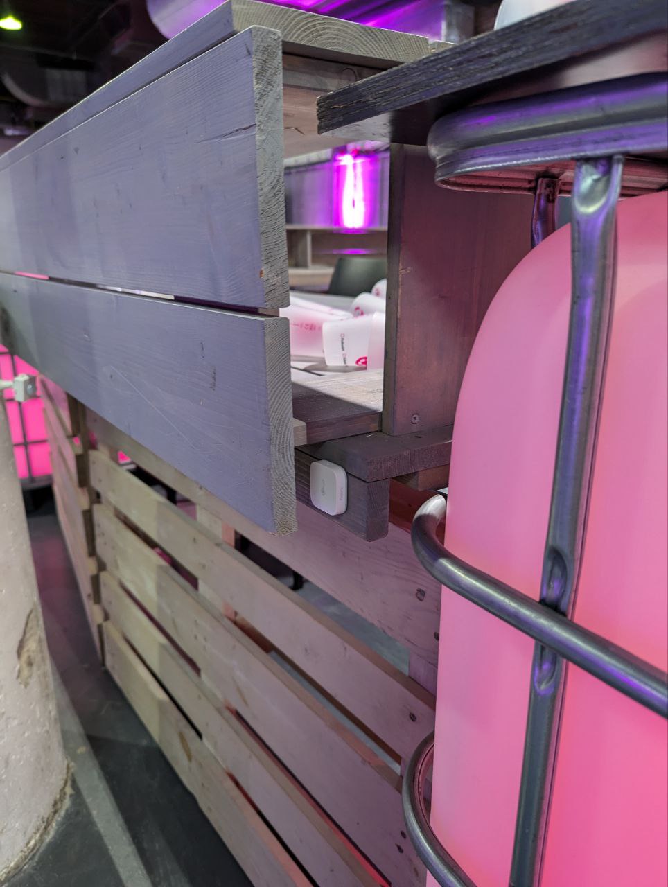 A motion sensor was also placed at the main bar counter and oriented to trigger only when a person was directly at the counter. It can be seen on the left on the column. A temperature and humidity sensor was also installed nearby: