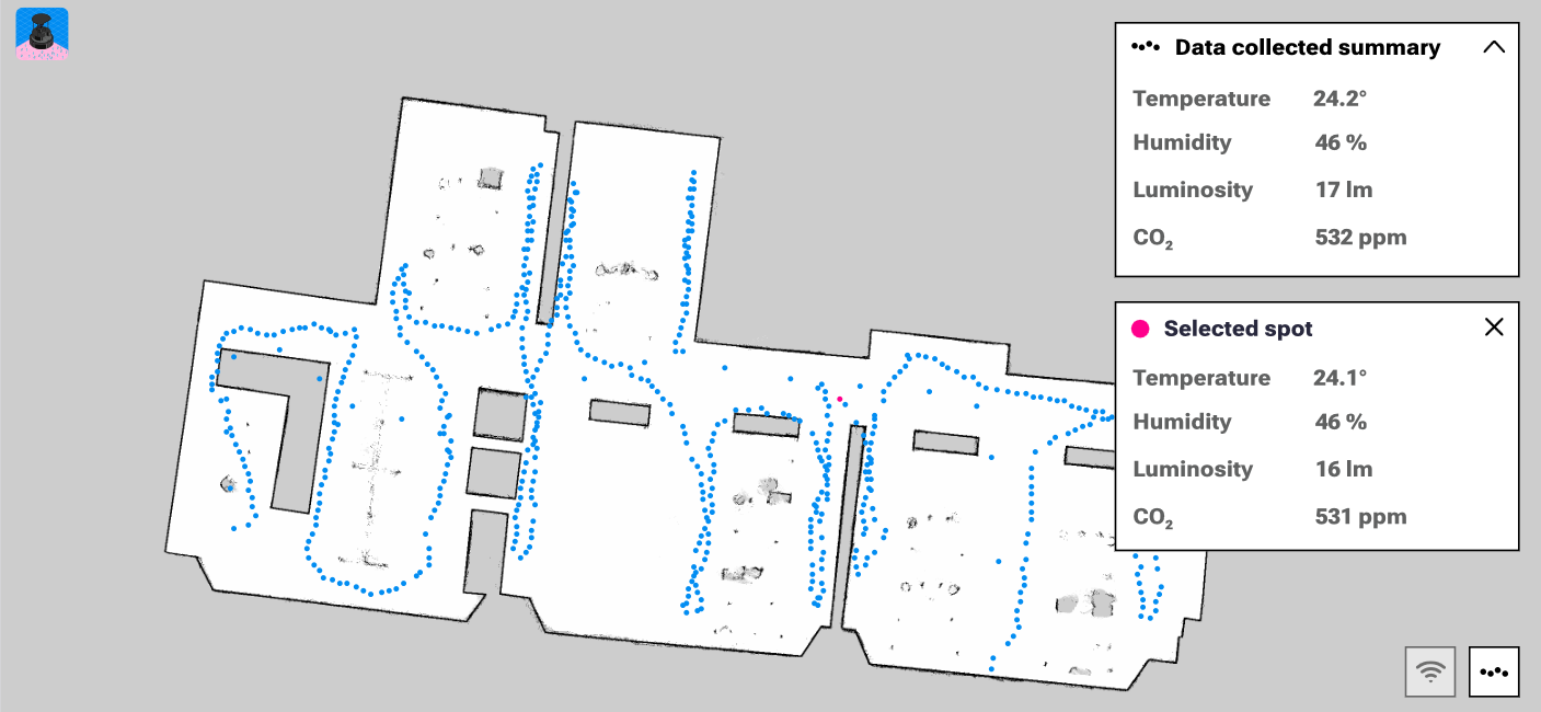 Then, based on the map, the robot embarked on a mission to collect data. After its completion, data about air quality and Wi-Fi signal quality were collected along with data about the robot’s location on the map. This allowed the harvested data to be combined with the points where they were collected. In the end, the final archive was sent for processing and visualization.