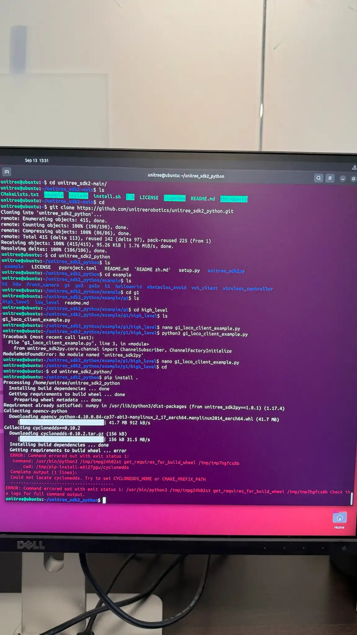 - Built packages from the unitree_ros2 repository, including CycloneDDS support.