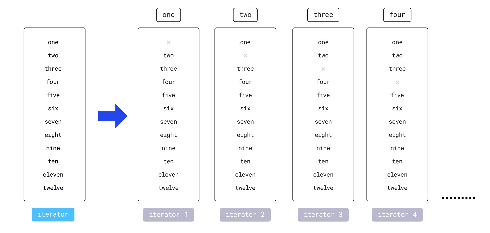 I googled a Python multiprocessing package to load all the logical cores of my CPU (20 of them) to parallel the computations. Otherwise, it would have been an eternal journey. But with that I had to split my iterator in 12 parts. The itertools multiprocessing packages do work together, but when a whole set of options is in the RAM. That was not my case, so the following was performed:
