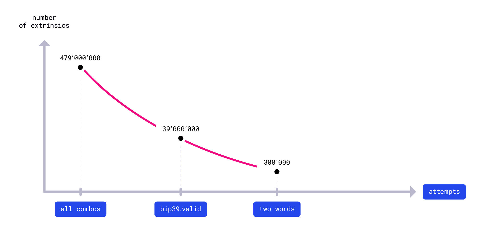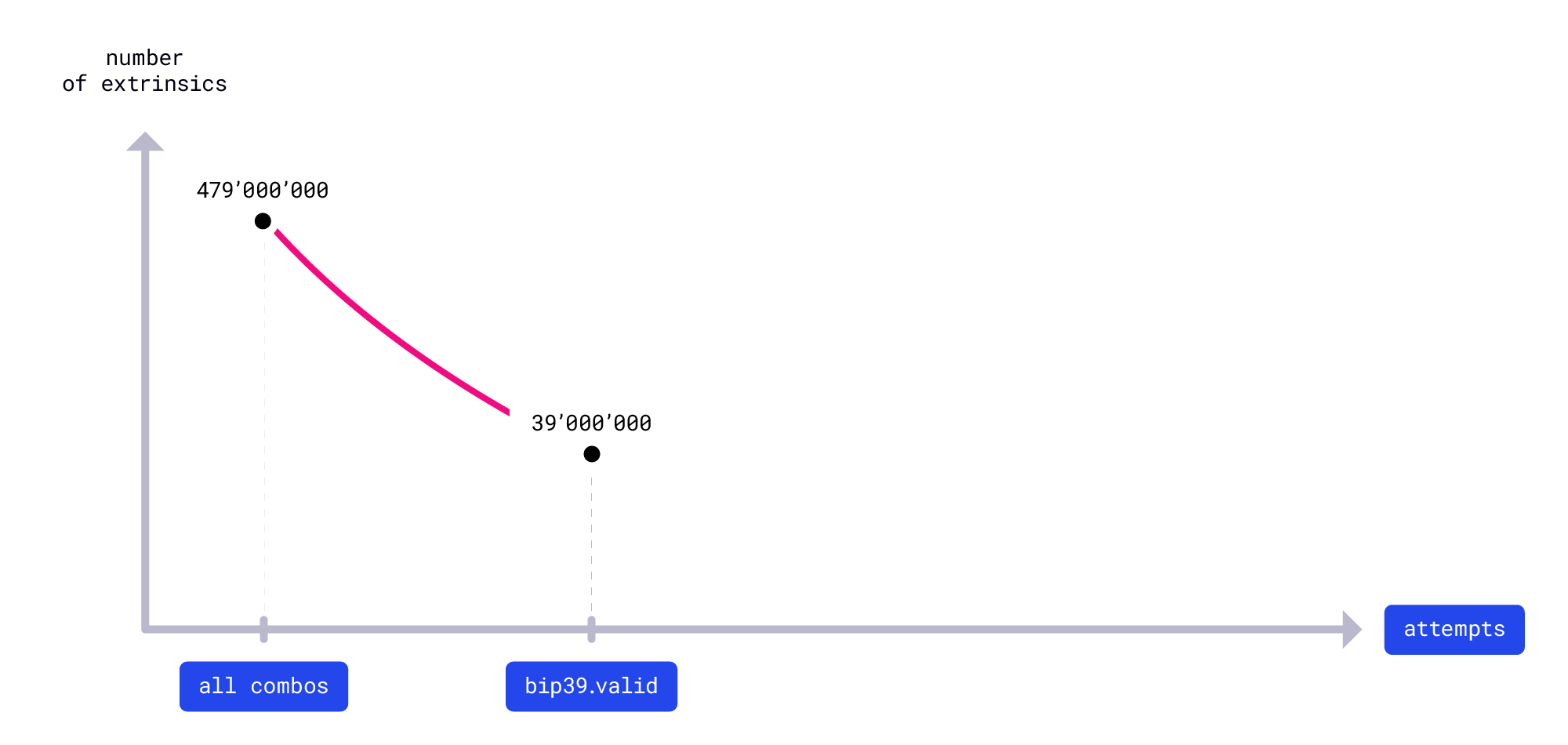 Just for a debugging reason I started the script (for node communication I used a py-substrate-interface package) and noticed that prior to call performing I got errors like invalid mnemonic phrase. A clue! If I could validate the combination on prem, I would save tons of time! GitHub parsing led me to this line of code and I added a combination validation to my script. This has reduced the number of potential extrinsics down to roughly 39’000’000 12 times faster!