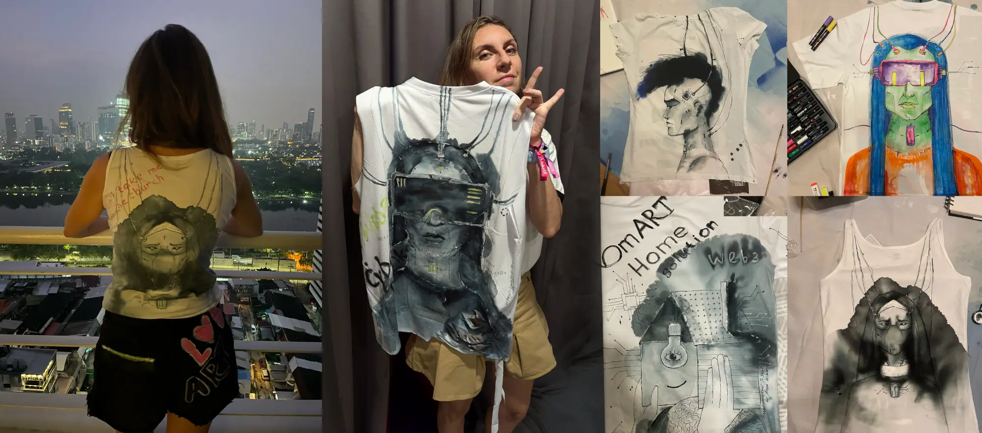 While in Bangkok, I was inspired by the city and its atmosphere to embark on a new experiment — painting on t-shirts. I created several prototype t-shirts in cyberpunk style and plan to launch a full collection in 2025. Each t-shirt, like the paintings, will be equipped with a digital passport uploaded to the Polkadot parachain through the Feecc project.
