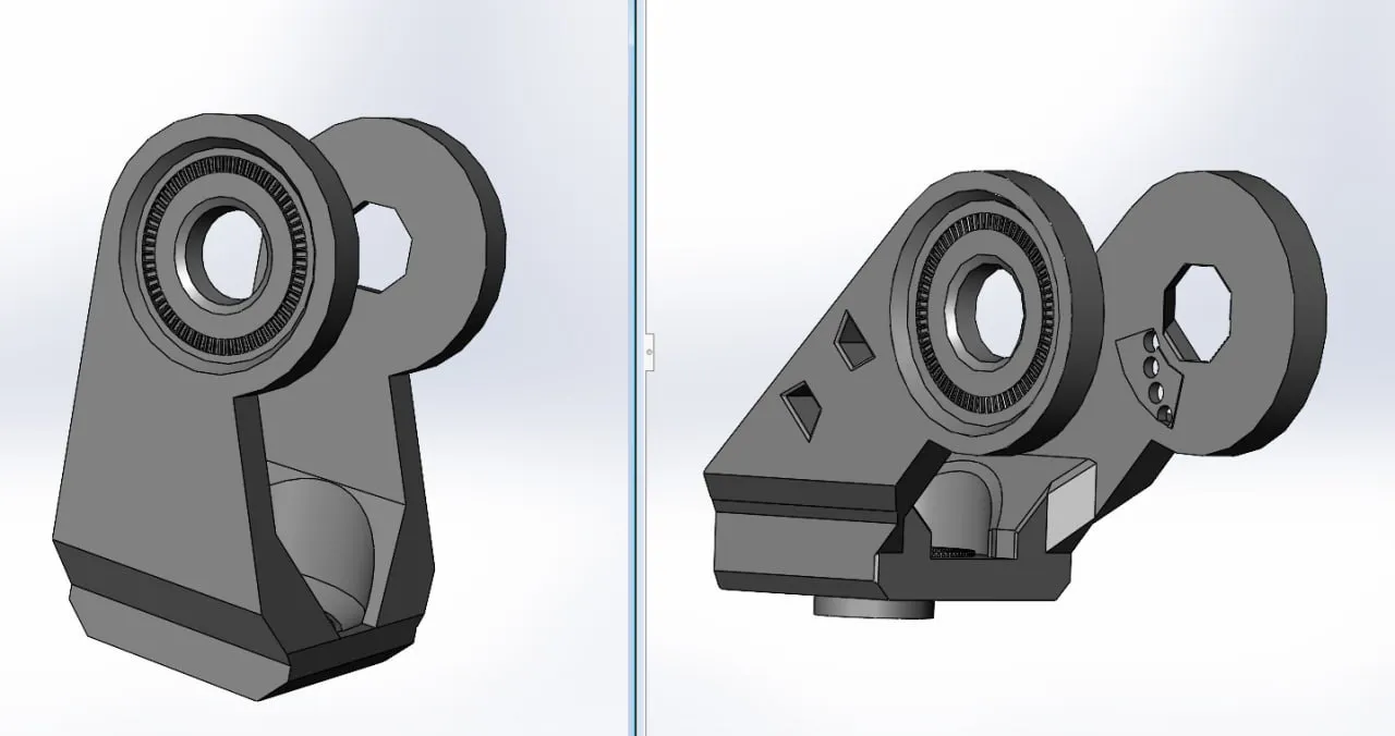 At our motion control programmer’s request, we redesigned the fork—the component that connects the manipulator’s drive links into a single kinematic chain. The previous design offered a larger working radius but caused frequent singular positions during trajectory calculations, complicating simulation control. Our new fork design eliminates this issue, making the robot’s kinematics more optimal and more similar to Kuka Iiwa ;D.