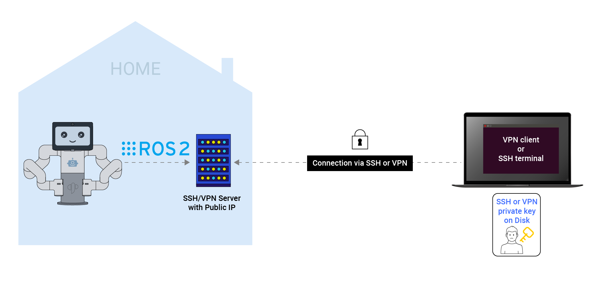 Here’s how users typically connect to their robots remotely these days. However, this approach has some drawbacks. It requires a public IP or/and DNS name, which can be blocked in some countries. It also necessitates the storage of additional private keys in potentially unsafe locations (e.g., ~/.ssh).