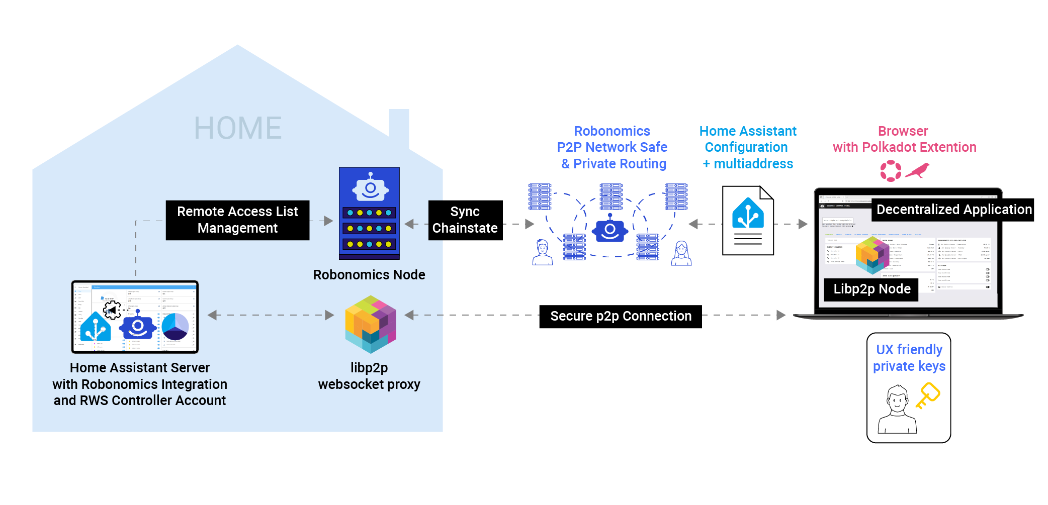 Let’s examine the connection process in more detail. The decentralized Robonomics application (or just DApp) works directly in your browser, it does not require you to install any additional software or the need to store keys in the file system in an environment of a large number of programs, the security of which you cannot be sure. Access key management is performed through the Polkadot JS extension, as well as with the help of an external hardware key storage (for example, Polkadot Vault) for additional reliability. In addition to specialized software for interaction with Robonomics, DApp also includes a lightweight libP2P node, with which the connection to Home Assistant takes place.