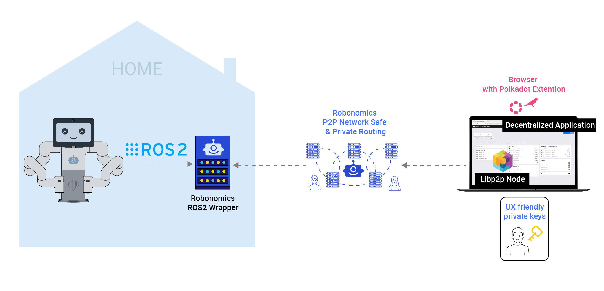 The protocol used in ROS 2, DDS, naturally combines with libP2P due to its similar publisher-subscriber model for node interaction. With the help of the Robonomics bridge, ROS 2 nodes and their interfaces - topics, services, message types (for example, using the eProsima Integration Service) can be declaratively configured, through which interaction with the robot from outside is possible. This also allows for an additional level of security when connecting to a remote computer. The mechanism for obtaining the PeerID of the counterparty can be the same as in the case with Home Assistant - through a Digital Twin request from the Robonomics node, with the only difference being that instead of the Home Assistant Server there will be a ROS 2 robot, and instead of the libP2P-websocker-proxy there will be a Robonomics ROS 2 Wrapper connected to the robot.